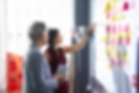 Man and woman looking at colorful adhensive notes on whiteboard in creative studio