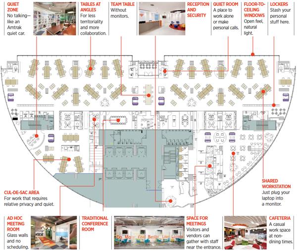 “GlaxoSmithKline, the global pharmaceutical giant, thinks it has found the cure for the drab, inefficient office: fluid spaces where you do what the moment requires, alone or in groups, moving throughout the day. Each employee has a laptop with a built-in “soft phone,” a locker for personal possessions, and maybe one file drawer. That’s it. Even US head Deirdre Connelly doesn’t have an office.”